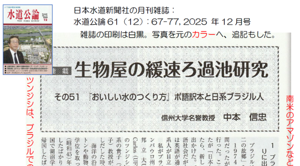 水道公論 2025年12月掲載記事 2025 12/14 一般 2025年12月14日 水道公論 2025年12月掲載記事『生物屋の緩速ろ過池研究 その51:「おいしい水の作り方」ポ語翻訳本と日系ブラジル人』 ↓下の画像クリックでファイルが開きます 一般 よかったらシェアしてね! URLをコピーしました! URLをコピーしました! 水道公論 2025年11月掲載記事 関連記事 水道公論 2025年11月掲載記事 2025年12月2日 JICA沖縄2025講義資料(要約資料、Youtubeリスト)/ JICA Okinawa 2025 Materials 2025年11月4日 水道公論 2025年10月掲載記事 2025年10月25日 水道公論 2025年8月掲載記事 2025年8月17日 水道公論 2025年7月掲載記事 2025年7月28日 サイト始めました 2025年4月18日